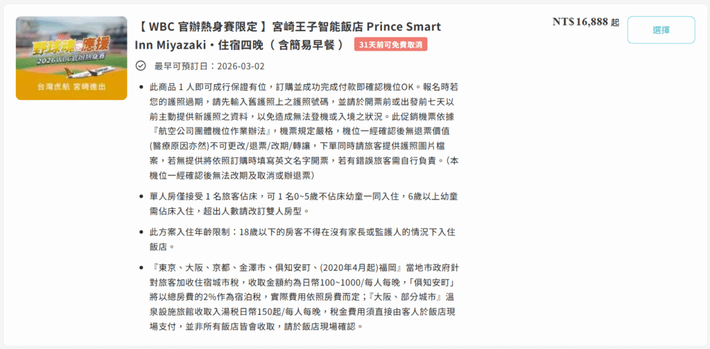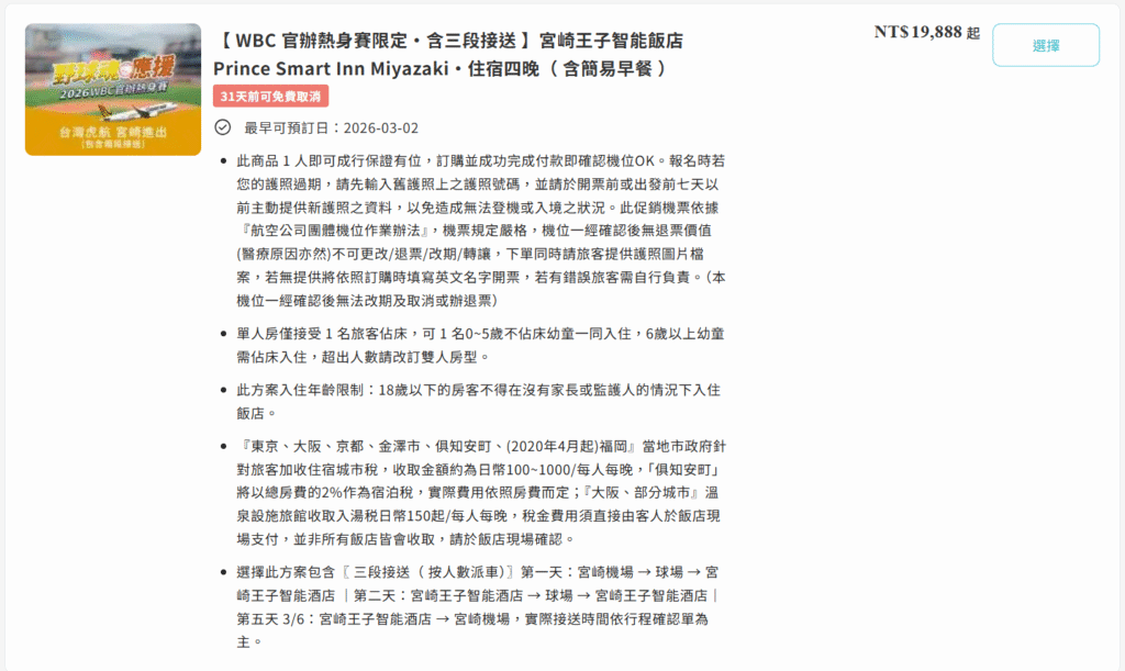 如果你不想一項一項分開訂機票、飯店、門票,那麼選擇WBC機加酒套裝絕對是最省時省力的方式。目前市面上有兩種主要方案,我們來詳細比較: